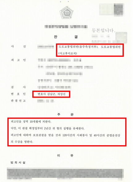 음주측정 3회 거부, 사고후미조치를 야기한 의뢰인을 법원으로부터 집행유예 2년형으로 방어에 성공하였습니다.