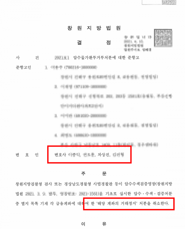 준항고인들은 창원지방검찰청 검사 또는 경상남도경찰청 사법경찰관 등을 상대로 압수수색검증영장(창원지방법원 2021. 3. 9. 발부, 영장번호: 2021-1561)에 기초하여 실시한 압수·수색·검증처분 중 별지 목록 기재 각 금융계좌에 대하여 한 '해당 계좌의 거래정지' 처분의 취소를 구하는 준항고를 제기했습니다.