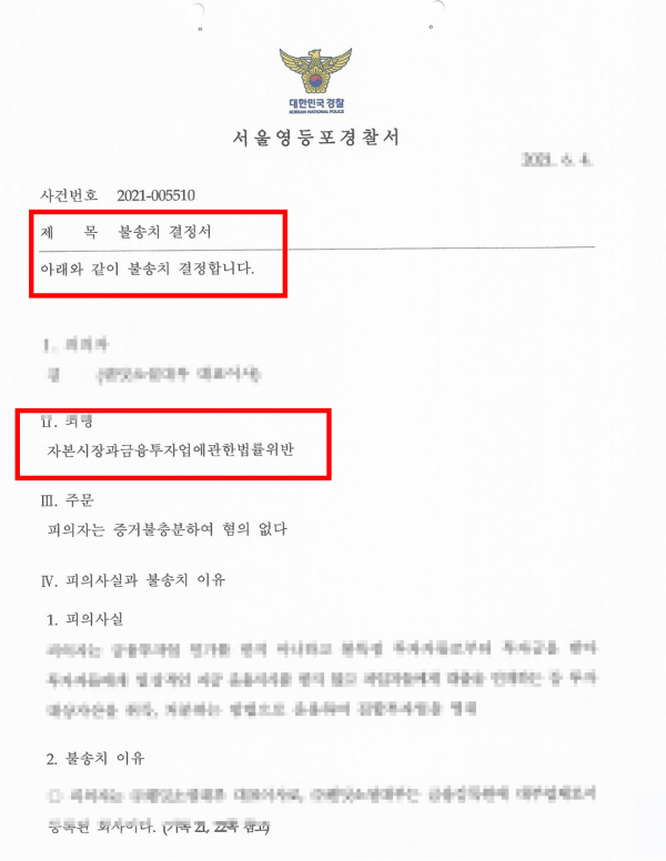 [형사] 자본시장과 금융투자업에 관한 법률 위반 혐의 불기소 사건 페이지 정보 본문 서비스 분야 자본시장 불공정거래 변호사 1. 사건 개요의뢰인는 대부업체의 대표이사로, 금융감독원에서 2019년 10월 28일부터 11월 8일까지 진행된 부문검사에서 "검사 결과 요구사항이 없다"는 통보를 받은 사실이 있었습니다.금융투자업 인가를 받지 않고 불특정 투자자들로부터 투자금을 받아 투자자들에게 일상적인 자금 운용지시를 받지 않고 차입자들에게 대출을 연계하는 등 투자대상자산을 취득, 처분하는 방법으로 운용하여 집합투자업을 영위한 혐의를 받았습니다.2. 변호인의 조력비컴의 차상진 변호사는 P2P 금융업계에서는 원리금 수취권이 금융투자상품이 아니라고 통용되어 왔으며, 금융감독기관에서도 원리금 수취권이 금융투자상품이라고 하여 무인가 투자매매업으로 규제한 바가 없었다는 점을 법리적으로 설명하였습니다.또한 2020년 8월 27일 시행된 온라인투자연계금융업 및 이용자 보호에 관한 법률에서도 원리금 수취권은 자본시장법상 금융투자상품으로 보지 않는다는 점을 강조하였습니다.3. 법원 판결 P2P 플랫폼에서 투자 시 직접 투자금액을 설정하고 대출 채권 목록을 확인하면 차입자들의 신용정보, 상환 방식, 투자 기간 등을 확인할 수 있었던 점이 인정되었습니다.고발인이 제시하지 못하는 등 고발내용의 주장을 뒷받침할 근거가 부족하다고 판단하였습니다.결과적으로 검찰은 증거불충분으로 혐의없음 처분을 내렸습니다.비컴은 성공사례로 증명합니다. 지금 비컴과 상담을 받아보세요. With Become, Become a Winner. 이전글[형사] 정보통신망법 위반(명예훼손) 불기소 사건 다음글[형사] 업무상횡령 및 업무상배임 혐의 불기소 사건