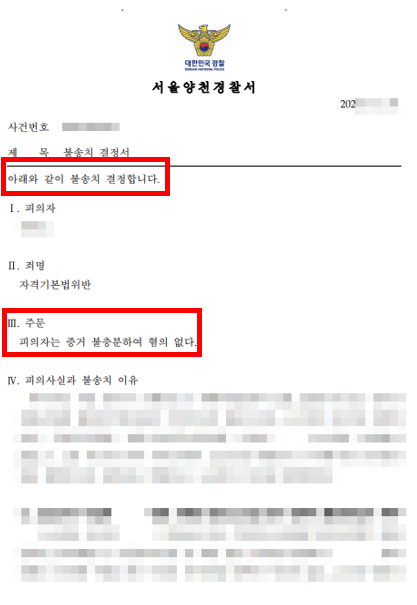 B경찰서는 비컴의 차상진 변호사가 제출한 증거와 주장을 받아들여, 의뢰인 A씨에 대해 ‘혐의없음(증거불충분)’ 불송치 결정을 내렸습니다. 결론적으로, 비컴의 차상진 비컴의 차상진 변호사는 면밀한 사실관계 분석과 체계적인 법리 검토를 통해 의뢰인 A씨의 무혐의를 성공적으로 입증하여 ‘불송치 결정’을 이끌어냈습니다.