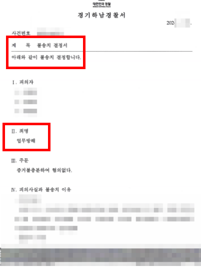 수사기관은 제출된 자료와 법리를 종합하여, 피의자들에게 업무방해의 ‘위력 행사’ 및 업무방해 결과의 현실적 위험을 인정하기 어려워 불송치 결정을 내렸습니다.