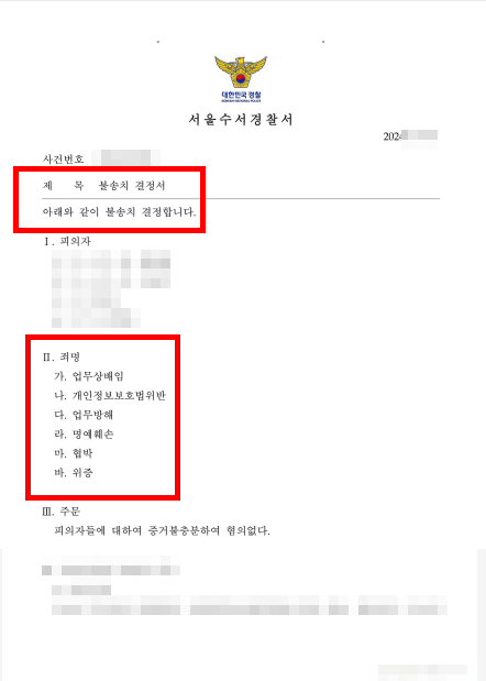 [형사] 업무상배임 · 개인정보보호법위반 · 업무방해 등 불송치 처분 사건