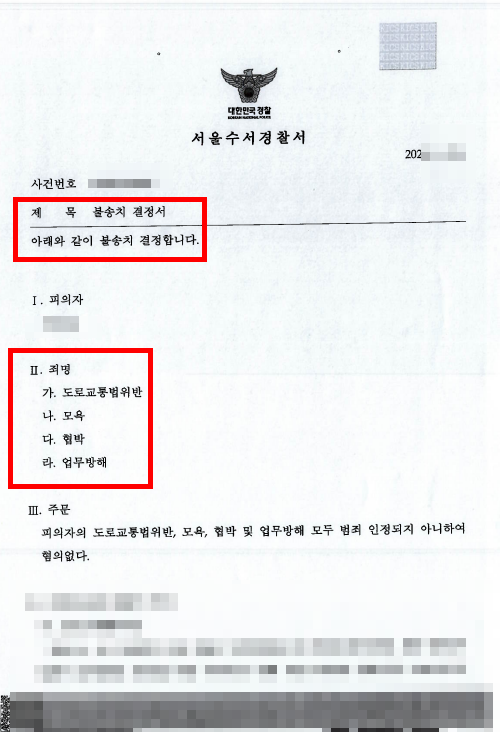[형사] 도로교통법위반 · 모욕 등 불송치 처분 사건