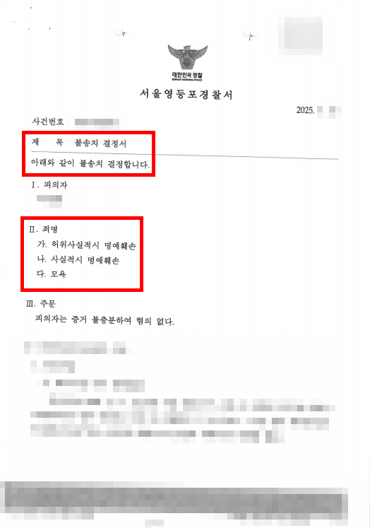 [형사] 허위사실적시 명예훼손 · 사실적시 명예훼손 · 모욕 혐의 불송치 처분 사건