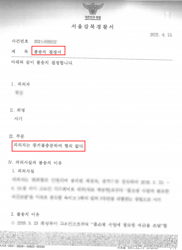경찰은 이러한 피고소인의 주장을 받아들여, 불기소 처분을 하였습니다.