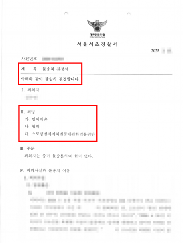 [형사] 명예훼손·협박·스토킹 혐의 불송치 처분 사건