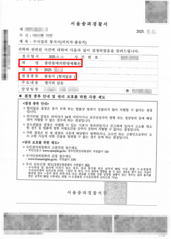 [형사] 출판물에 의한 명예훼손 혐의 불송치 처분 사건