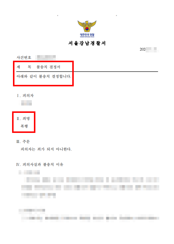 경찰은 의뢰인 김○○ 씨에 대해 ‘혐의없음(죄가 되지 아니함)’ 불송치 결정을 내렸습니다.