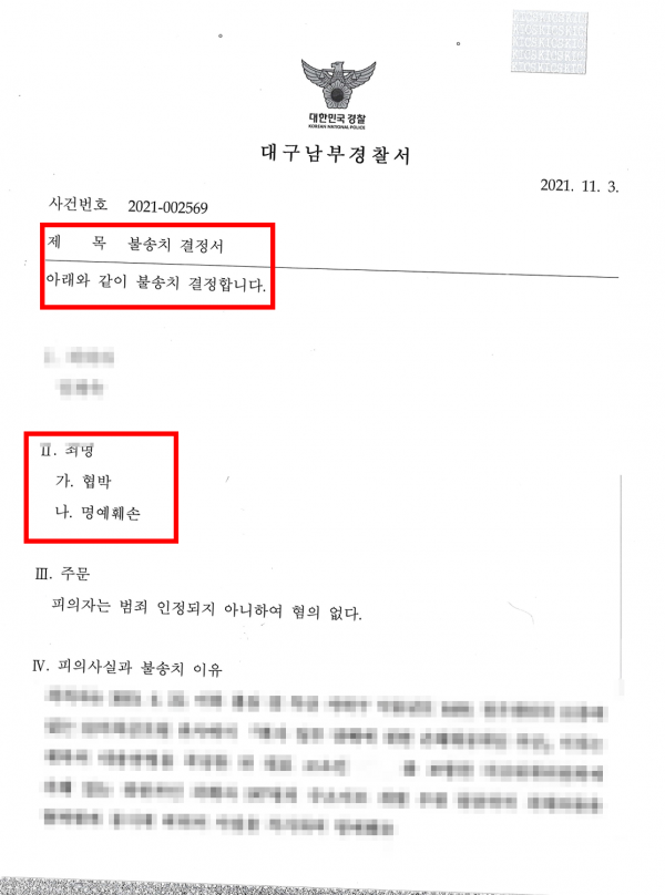 대구남부경찰서는 비컴의 차상진 변호사가 제출한 증거 및 주장을 받아들여 의뢰인에 대해 '혐의없음(증거불충분)' 불송치 결정을 내렸습니다. 특히, 의뢰인이 고소인에게 협박성 문자 메시지를 전송하였다는 사실을 인정할 만한 증거가 없다는 점을 명확히 하였습니다.